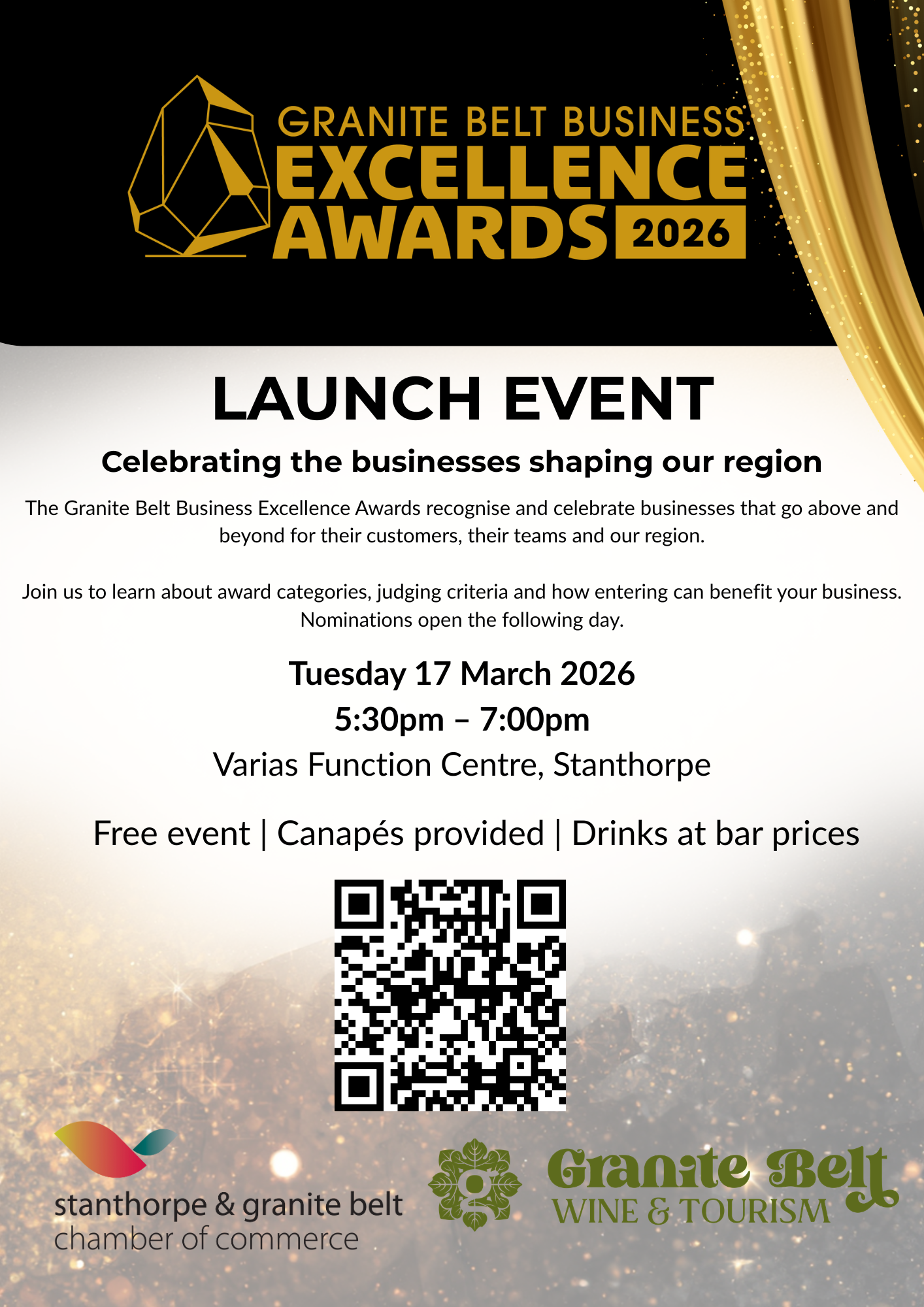 The Granite Belt Business Excellence Awards recognise and celebrate businesses that go above and beyond for their customers, their people and our region. Come along to our Launch Event to hear the details of the categories for the awards, the criteria for each, the resources that are available for intersted businesses and how entering the awards is good for your business. Nominations open the following day and so a great opportunity to hear the detail on how you can get involved!